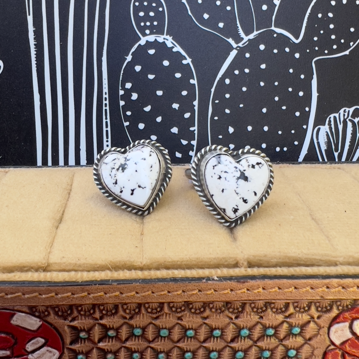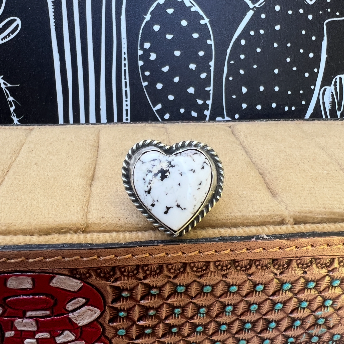 Snowy white with bold midnight matrix—this is White Buffalo at its most striking. Handcrafted by coveted Navajo silversmith Johnny Dixon, each ring centers a hand-cut White Buffalo cabochon in a sculpted .925 sterling bezel, framed with a classic twisted-rope border and rich oxidized contrast. The adjustable sterling band makes it an easy, everyday statement you can size to your perfect fit.