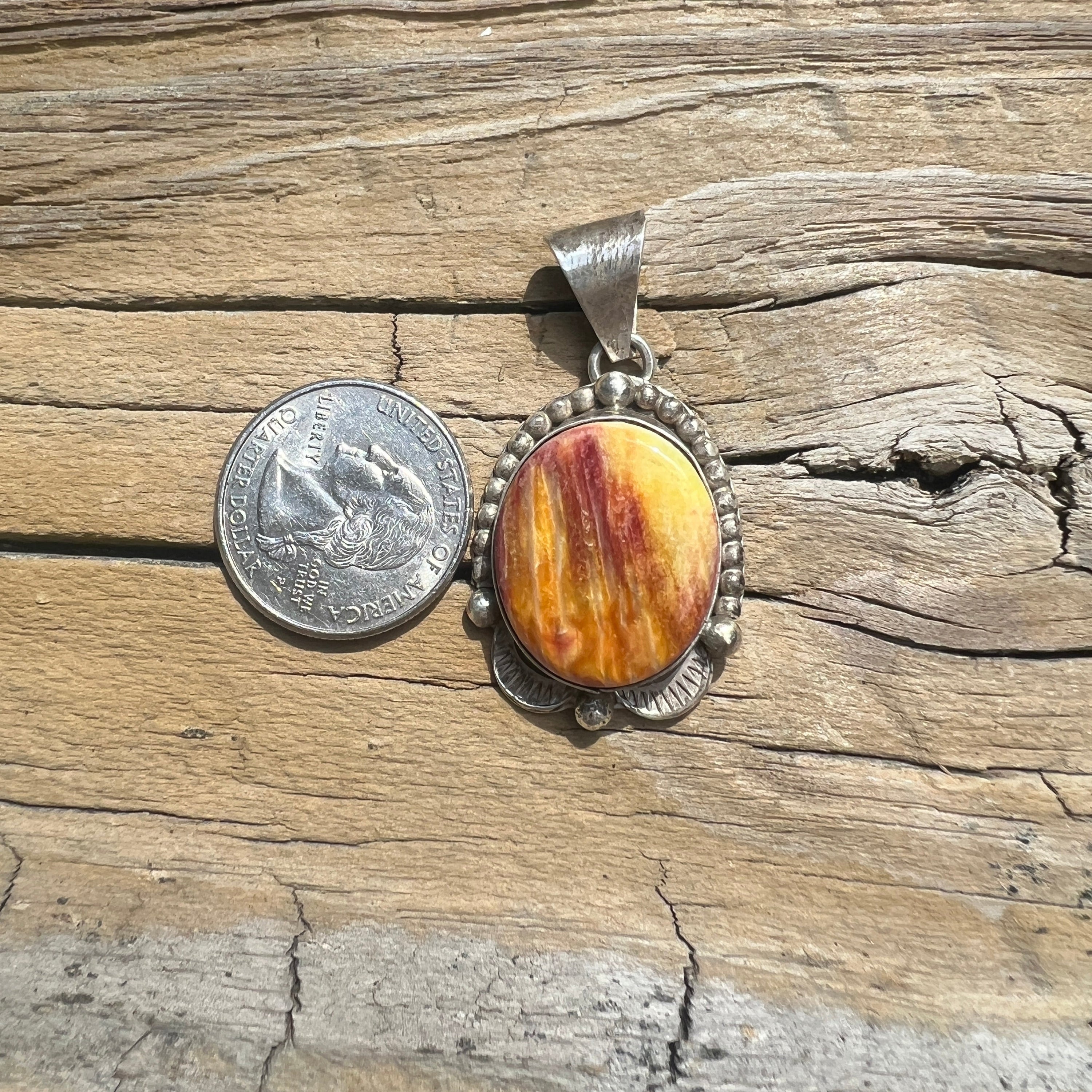 Catch the last glow of golden hour. Handcrafted by Tia Long (Navajo), these pendants showcase oval sunset spiny oyster cabochons—swirls of marigold, amber, and plum that look lit from within. Each stone is set in solid .925 sterling silver with a halo of petite raindrop beads, a stamped fan motif at the base, and a tapered bail that slips easily onto your favorite chain or Navajo pearls.