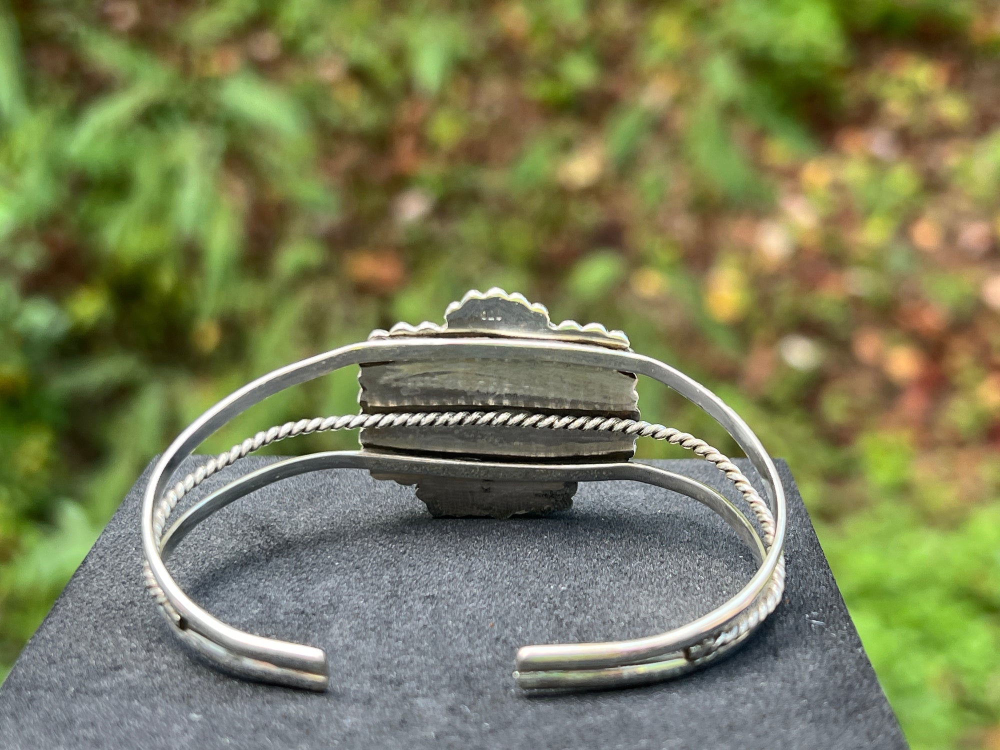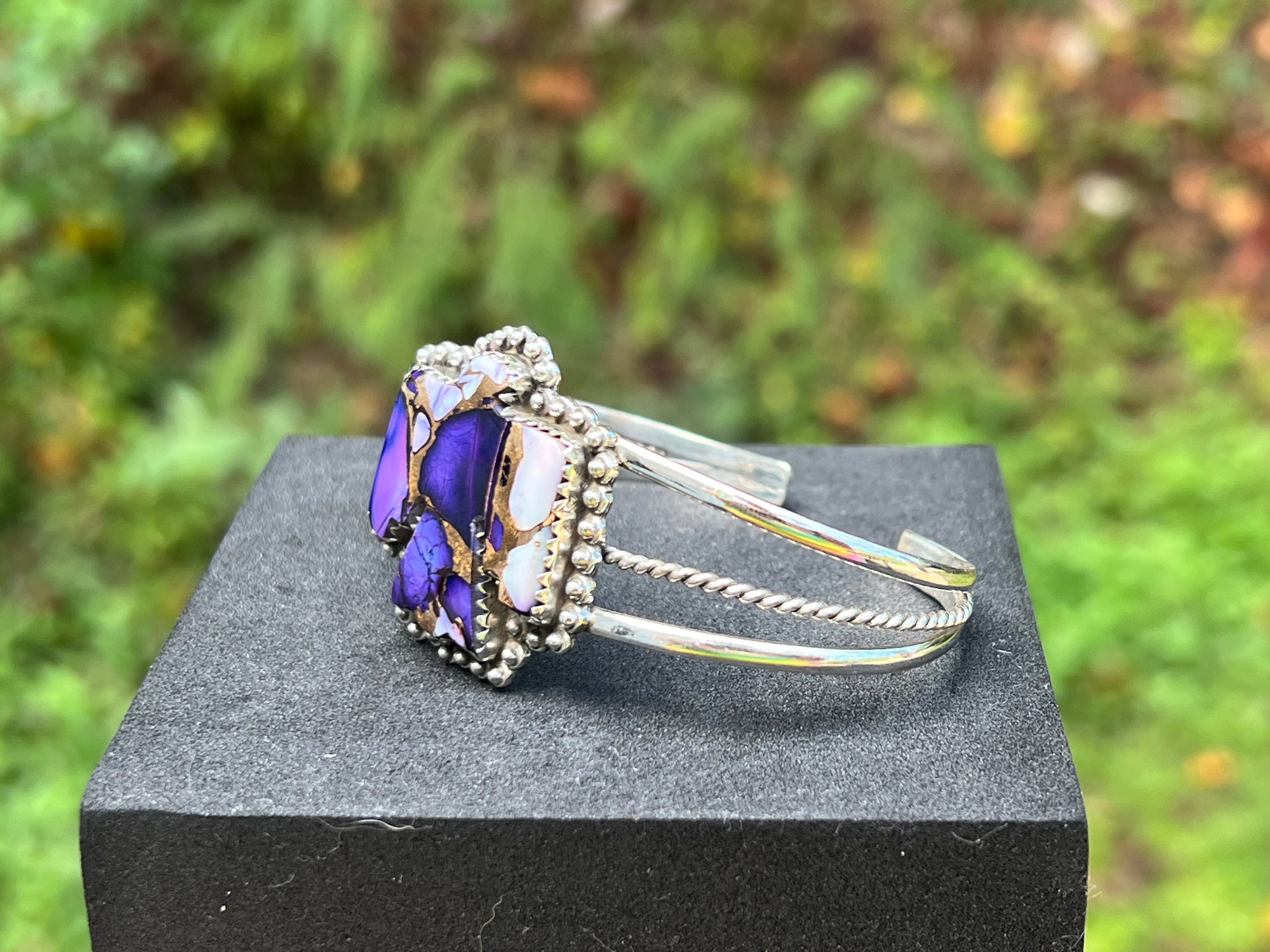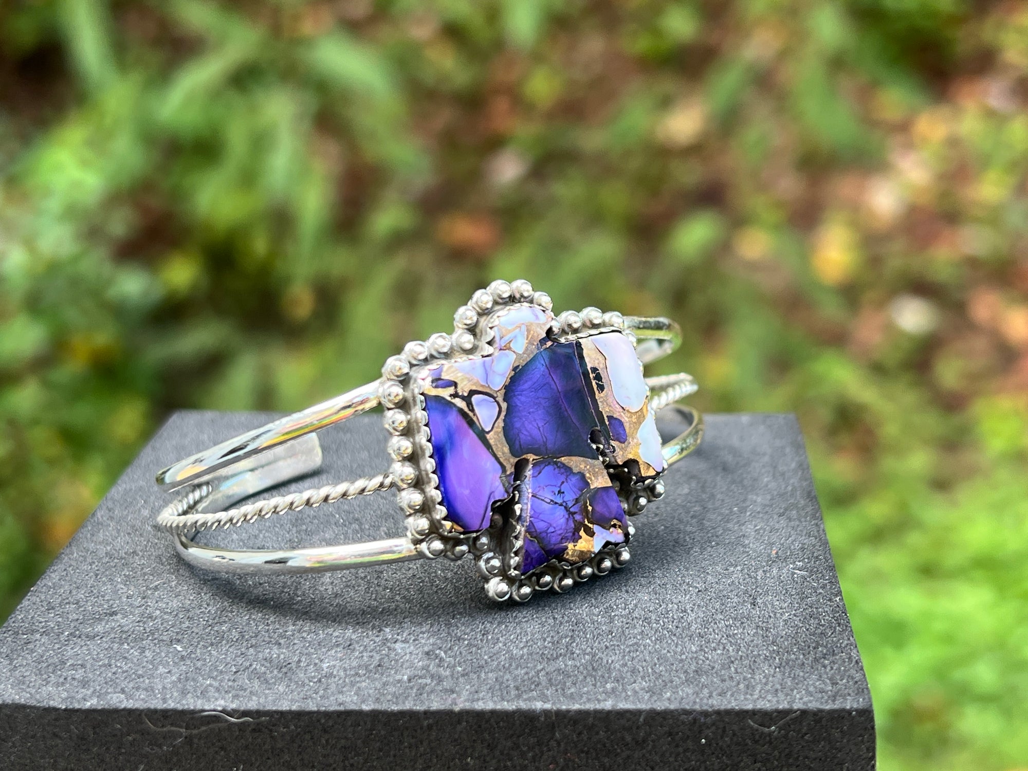 Bold and luxe. A mosaic of natural Purple Mohave—deep violet with creamy white and warm bronze matrix—sits center stage in a beaded frame atop a sleek triple-wire cuff (rope-detail center). Western romance with gallery polish.
