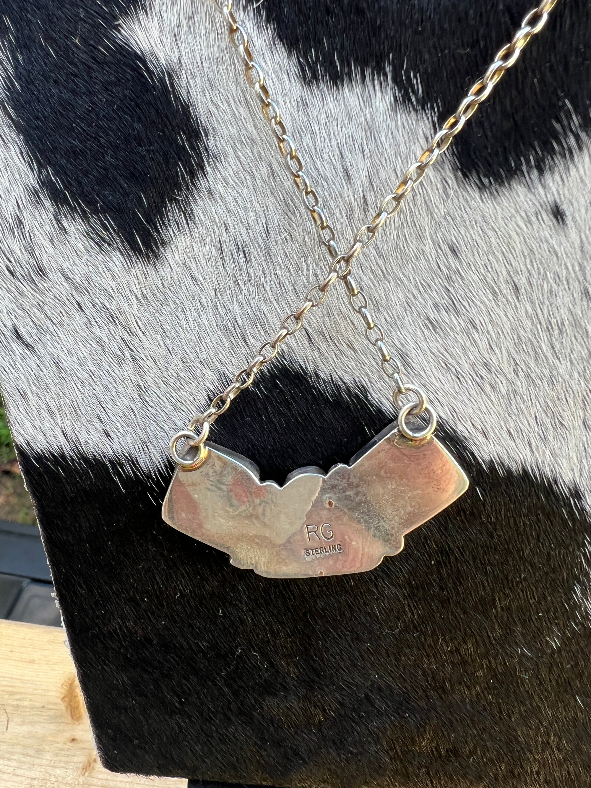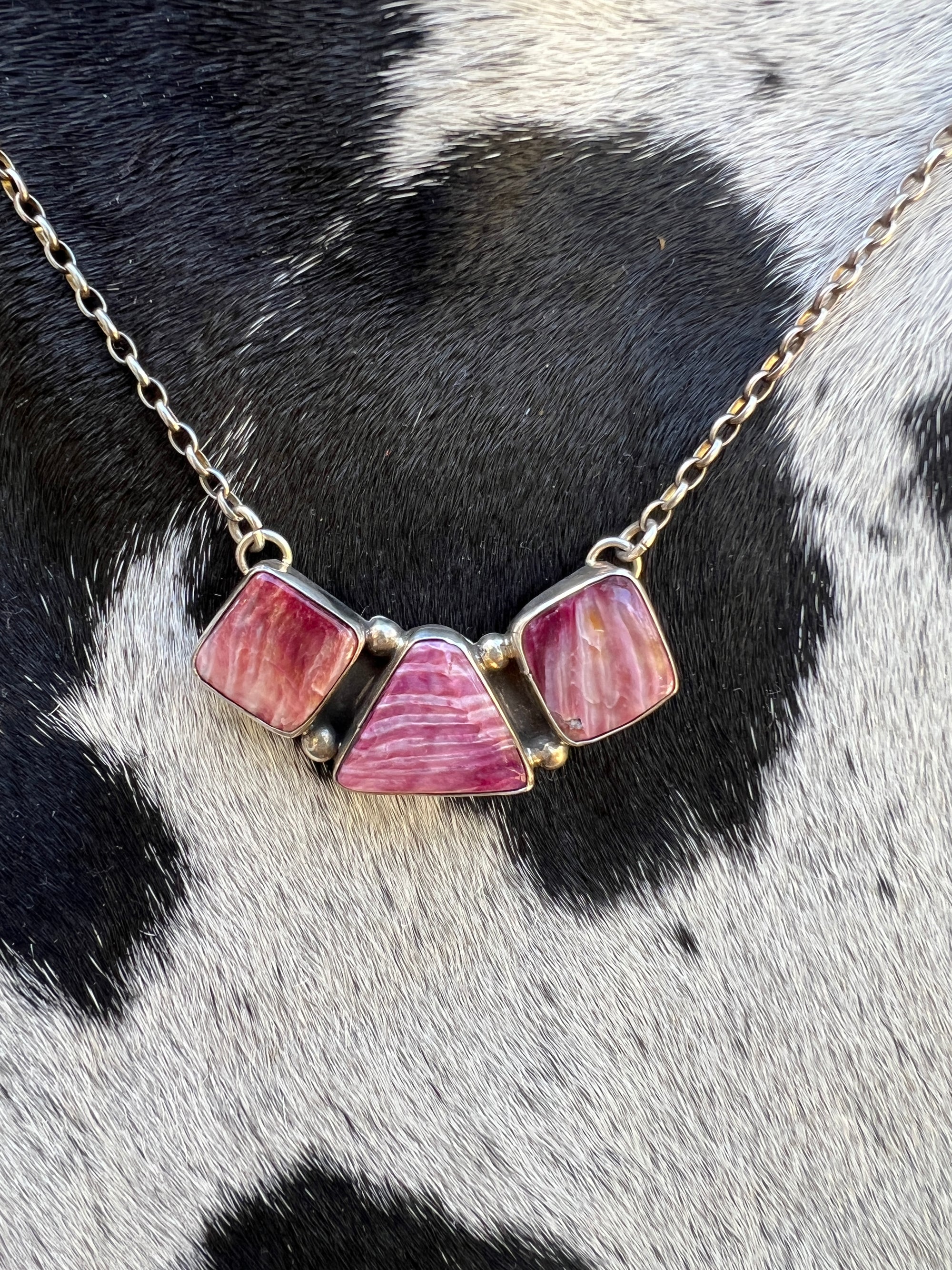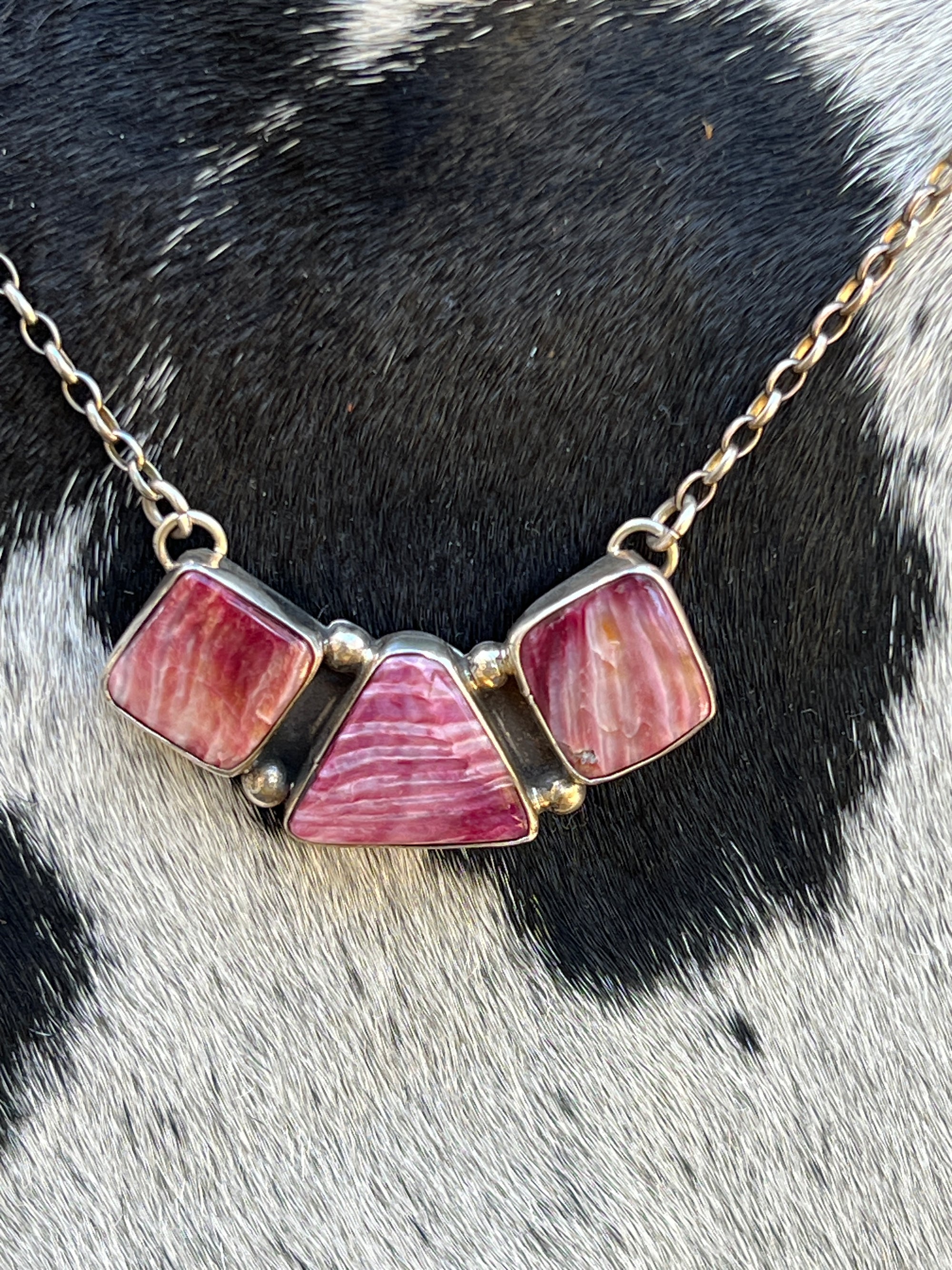 A little desert sunset for your neckline. Three hand-cut purple Spiny Oyster stones with natural golden/yellow striations are bezel-set in solid sterling and hinged into a sleek bar silhouette that lays beautifully at the collarbone. Crafted by Reva Goodluck, this piece blends gallery polish with everyday Western edge.