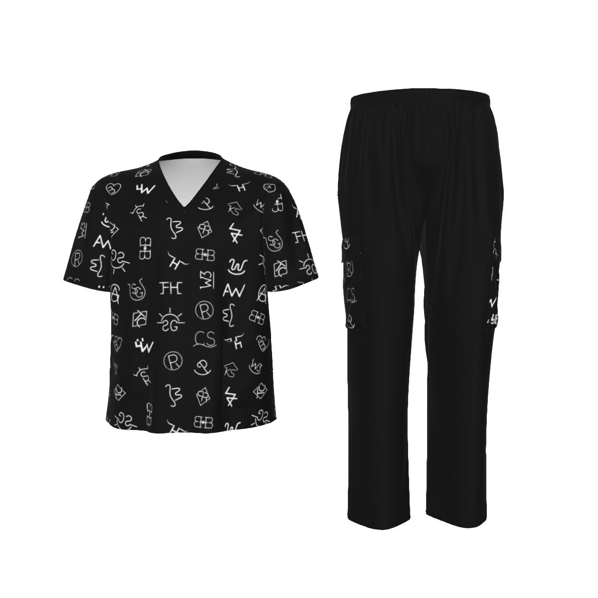 - V neckline,Two deep pockets,two side patch pockets on the pants and two patch pockets on the shirt