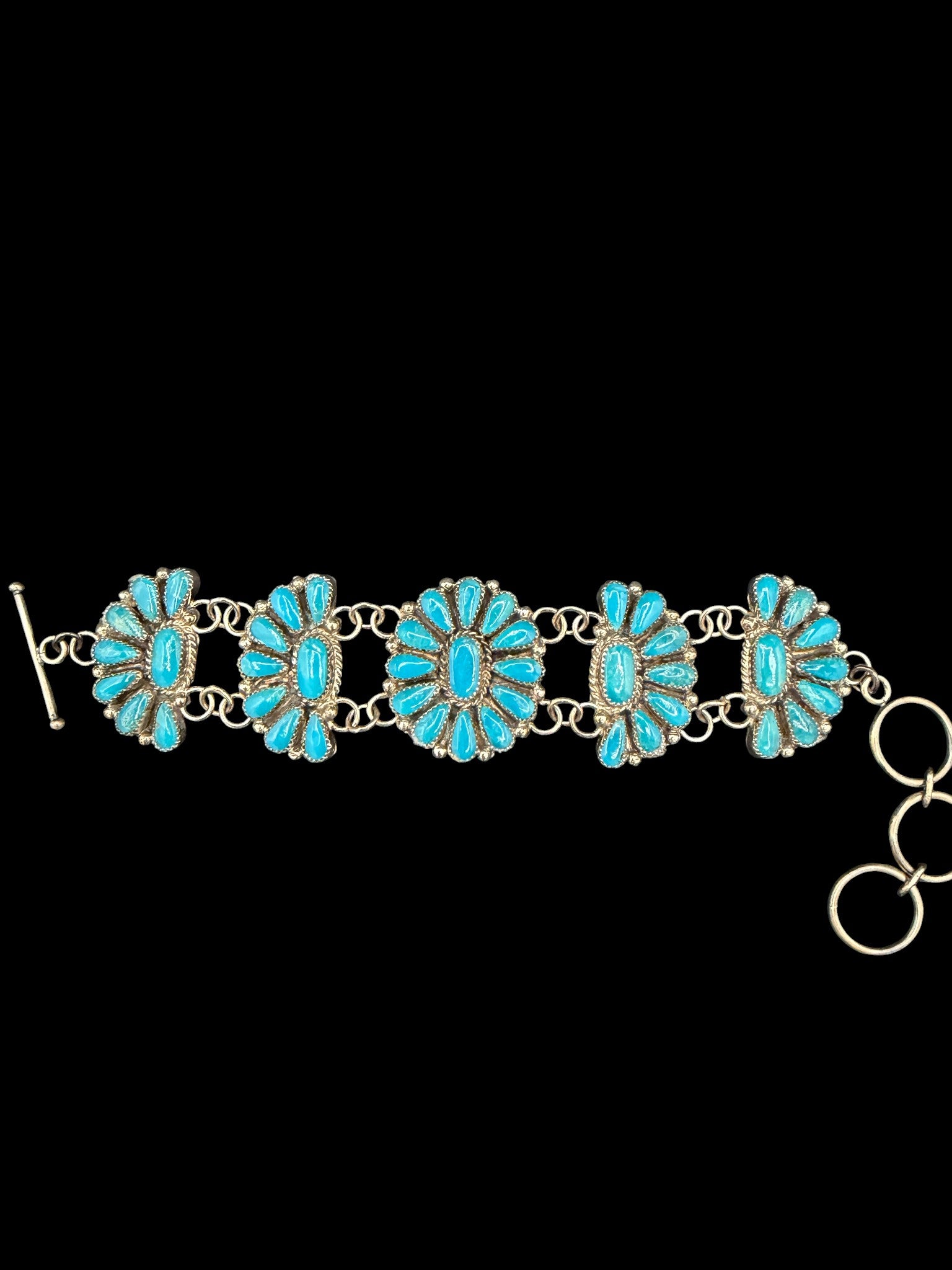 This extraordinary turquoise cluster bracelet by Navajo silversmith Alicia Wilson is the kind of piece that stops people mid-sentence. Built with five full cluster stations, each one hand-cut, hand-set, and glowing in rich sky-blue turquoise, this bracelet brings that bold, traditional Navajo silhouette to life.