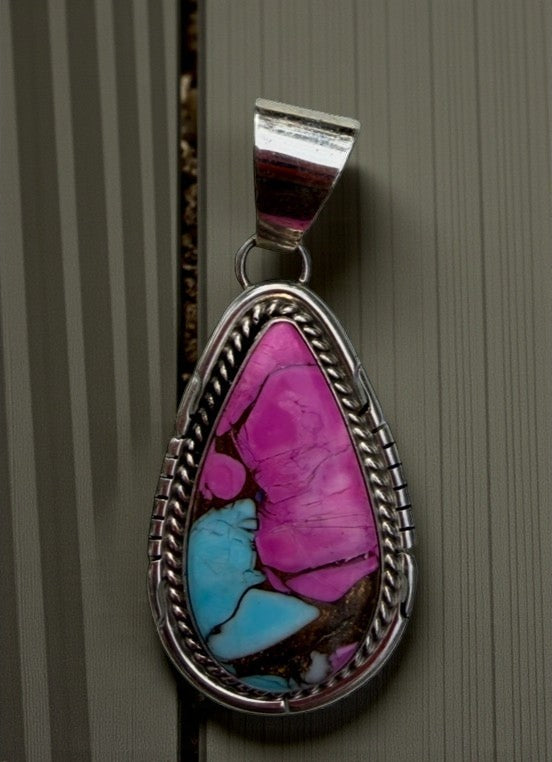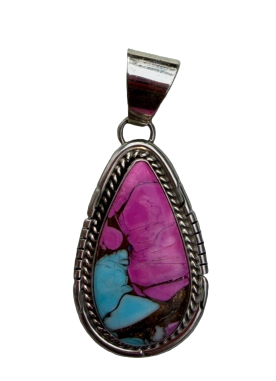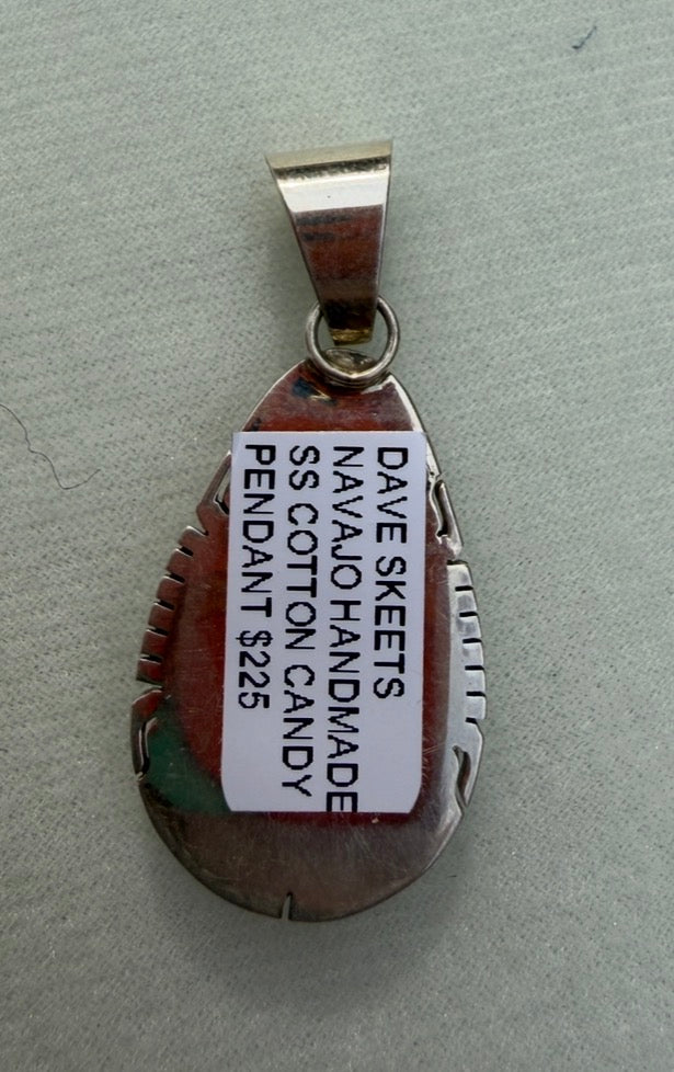 Sweet, bold, and full of color — this Cotton Candy Pendant by renowned Navajo silversmith Dave Skeets is pure eye candy. The teardrop design features vibrant pink and blue composite turquoise, framed in a finely detailed sterling silver rope border with hand-cut edgework.