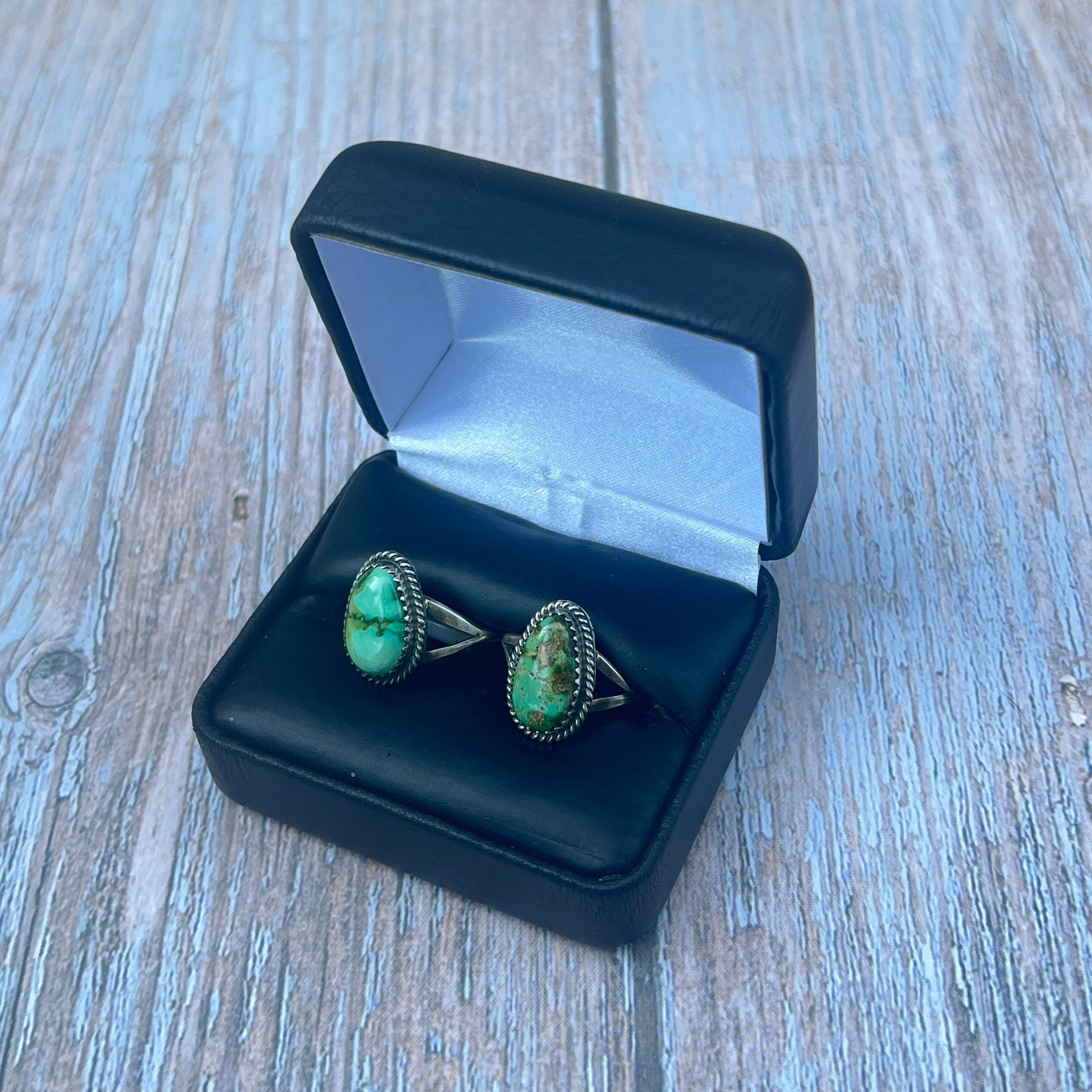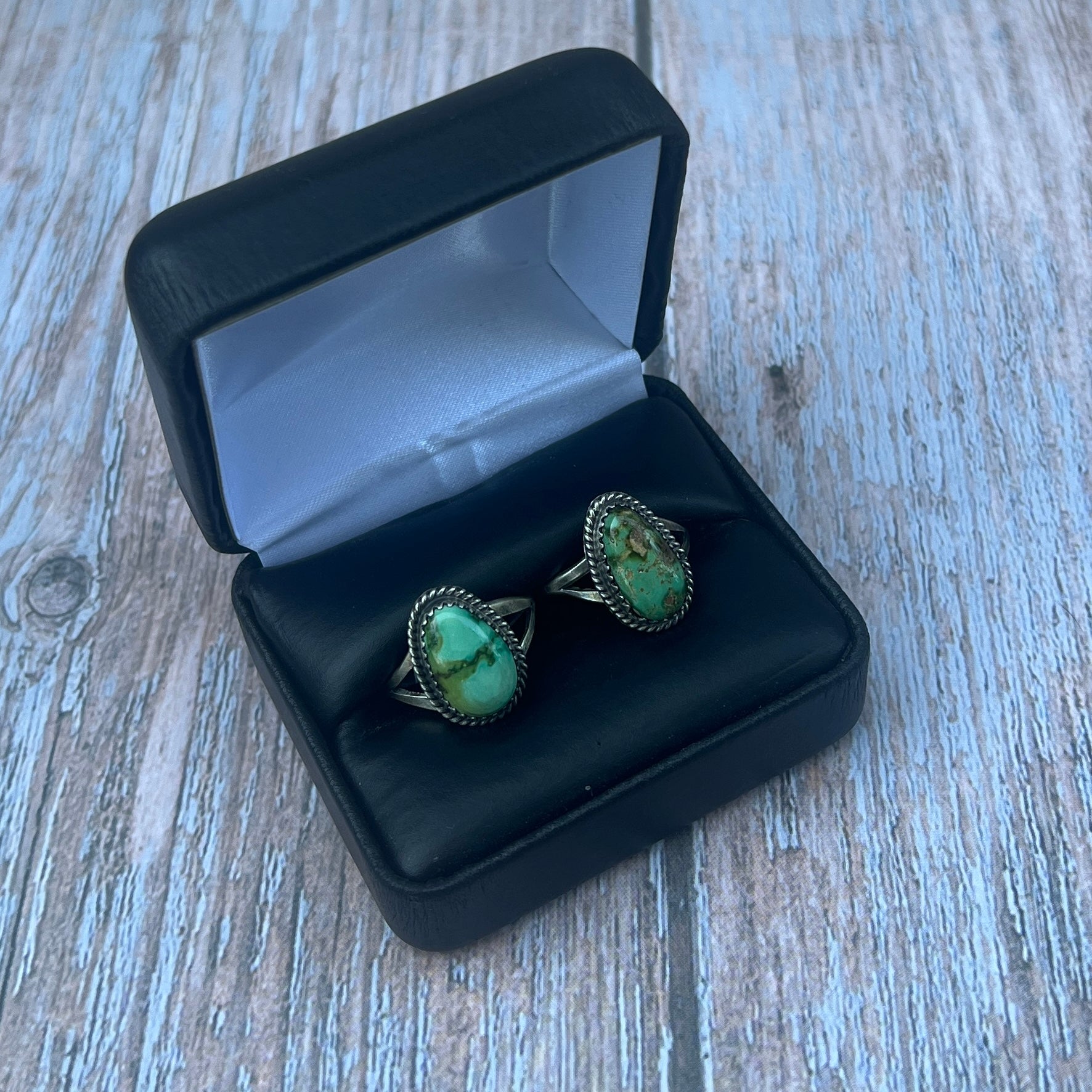 Crafted by Navajo silversmith Judy Largo, these Sonoran Gold turquoise rings are where fine craftsmanship meets Western soul. Each teardrop stone glows in vibrant shades of mint-green and gold matrix, set in solid sterling silver and framed by hand-twisted rope detailing — a signature hallmark of traditional Navajo design.