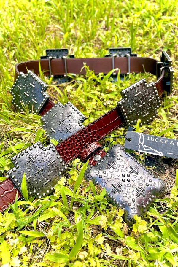 Elevate your accessory lineup with this Brown Croc Embossed Cross Studded Square Concho Belt — a premium statement piece for Western boutiques. Featuring bold antiqued square conchos embossed with cross and stud designs, this belt combines rugged elegance with contemporary Western flair. The rich brown croc-textured strap offers a luxe finish that contrasts beautifully with the dark silver-tone conchos. Perfect for pairing with denim, dresses, or fringe skirts, this belt delivers standout appeal and authentic cowboy-chic style your customers will love. A must-have item for rodeo-ready wardrobes, Western retail shops, and cowgirl fashion influencers. Gator-printed genuine leather belt featuring Cross conchos and buckles. The conchos can be adjusted for an ideal fit around the waist.