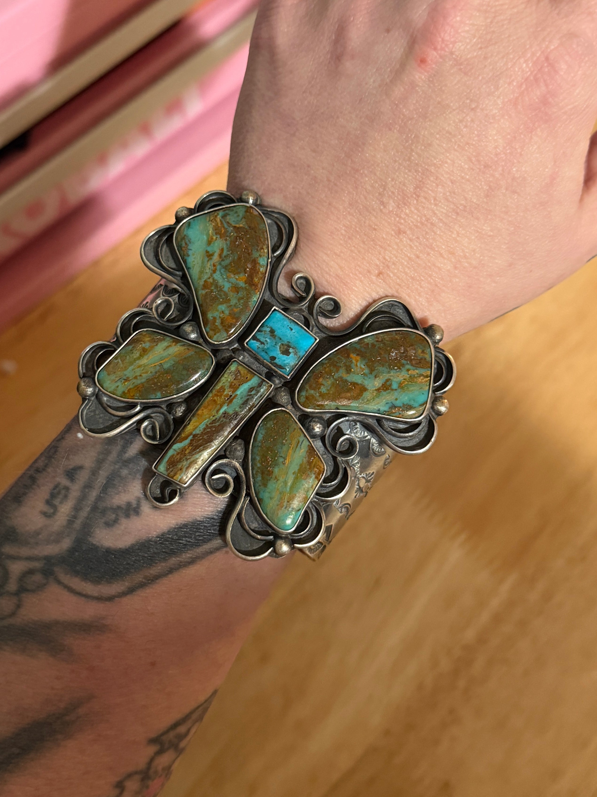 This is museum-level Southwestern silver—bold, architectural, and unmistakably elite. Crafted by Juan Guerrero for Chimney Butte, this massive butterfly cuff showcases extraordinary turquoise with rich earth-toned matrix and vibrant blue-green flashes that define high-grade work.