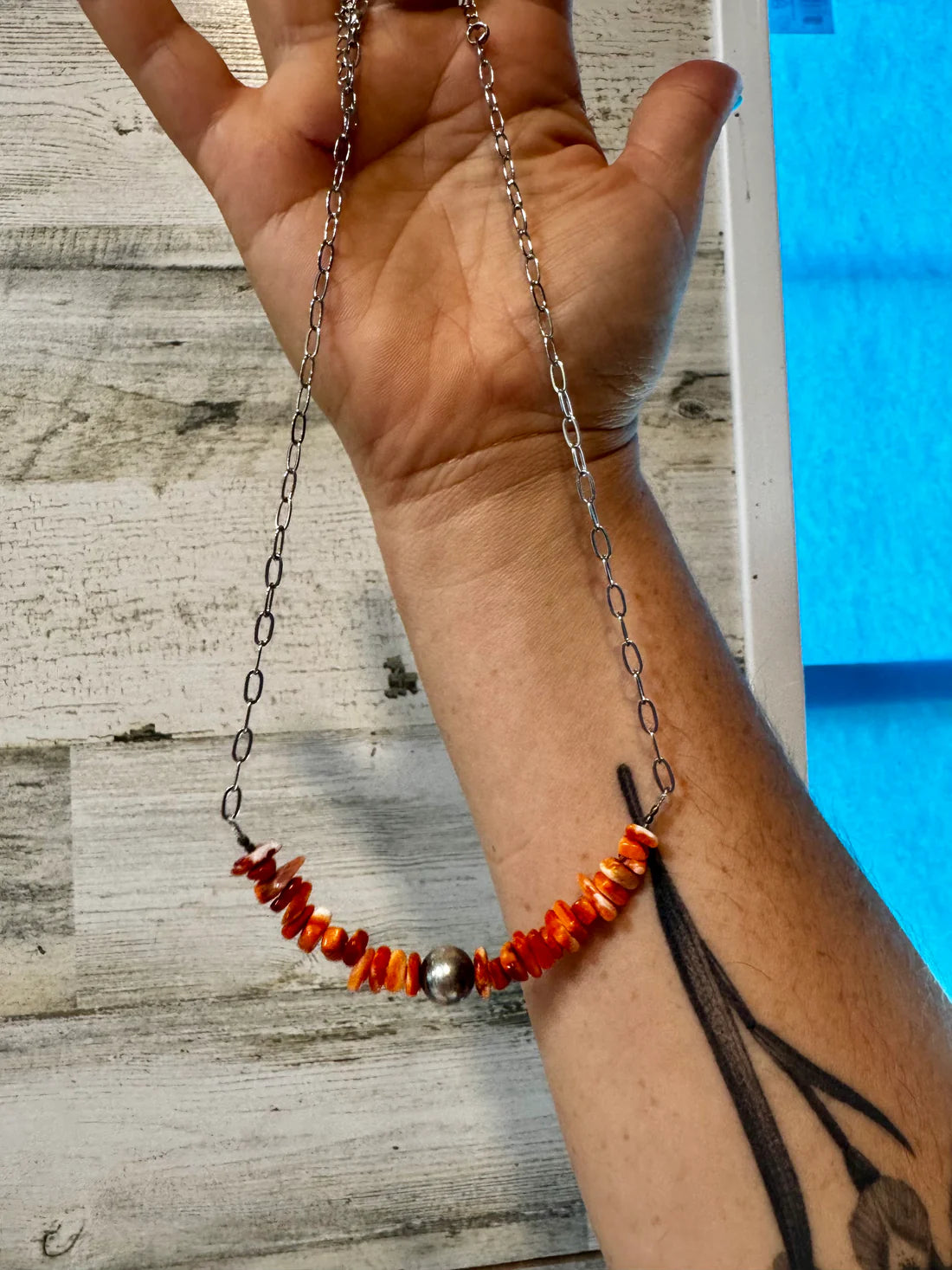 Handmade in the USA, this 17-inch paperclip chain (plus extender) brings together bold Southwestern texture and clean, modern lines. Warm orange and red natural spiny oyster shell chips create an organic, earthy focal bar — no two chips alike, because nature doesn’t copy and paste.