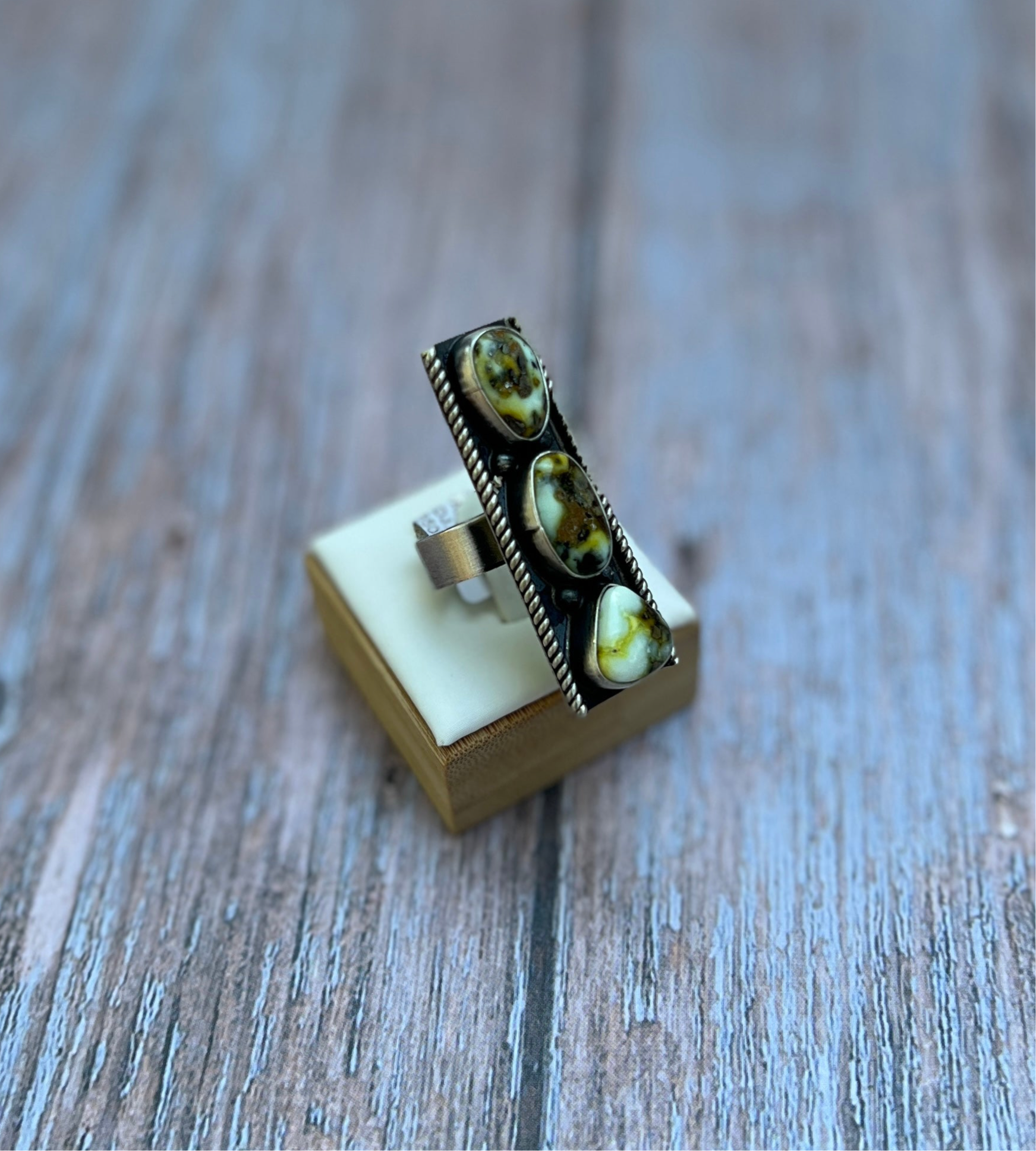 Big, bold, and breathtaking — this XL Palomino turquoise bar ring captures the wild beauty of the desert in every golden-green swirl. Each natural stone is hand-set in sterling silver and framed with classic Navajo-style rope detailing, balancing rugged soul with gallery-level craftsmanship.