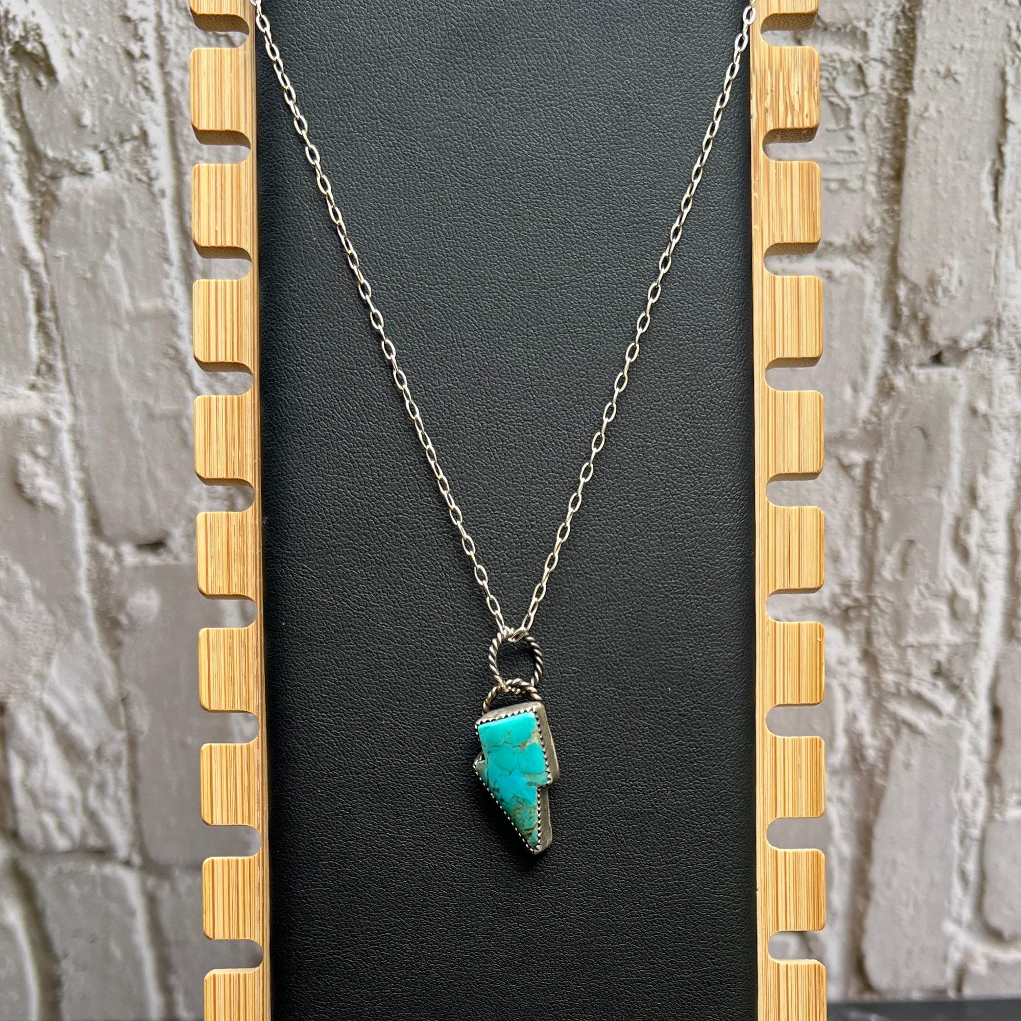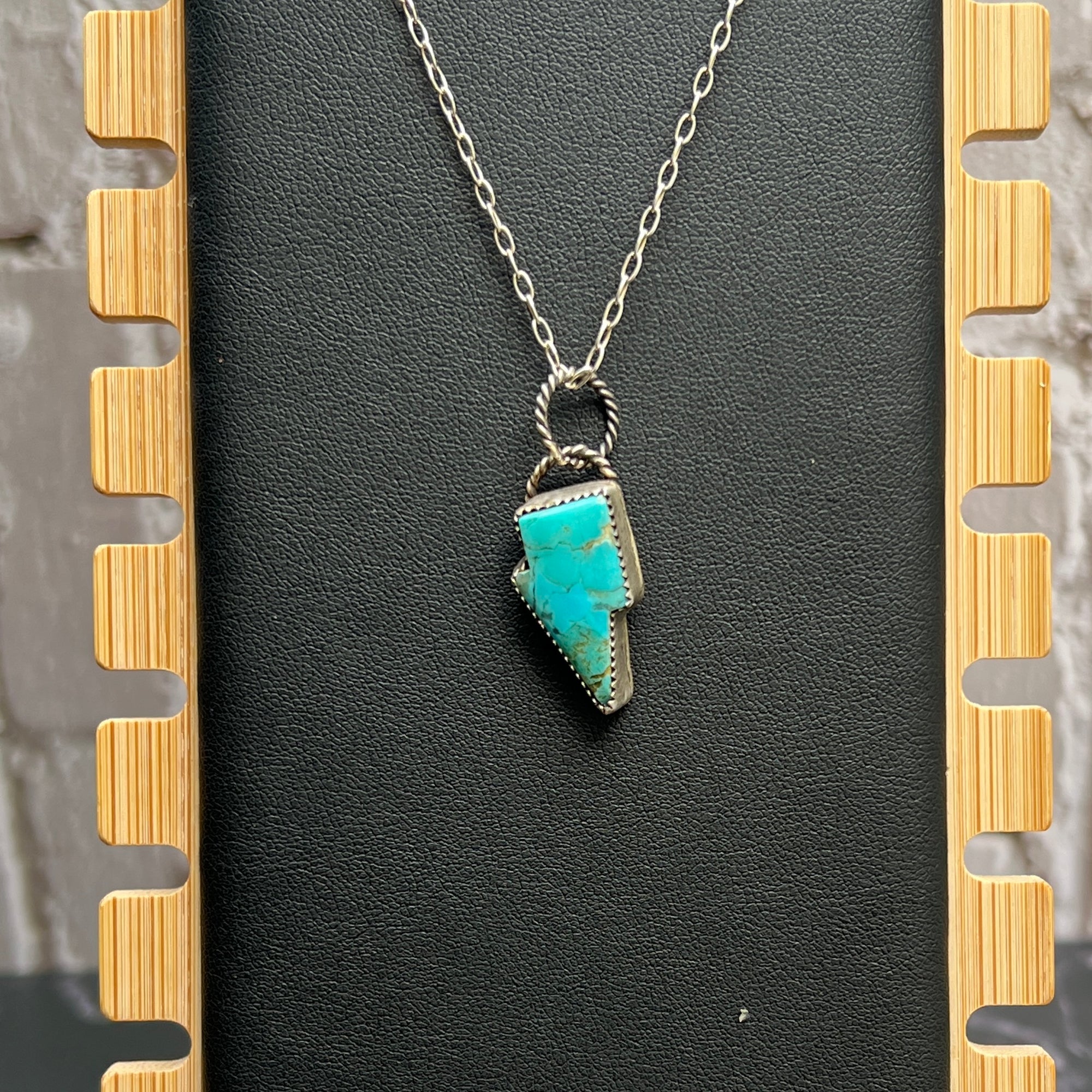 Strike bold with this handcrafted turquoise lightning bolt necklace, expertly made by a skilled silversmith. The natural turquoise stone flashes with vibrant sky-blue tones and golden matrix, set in a sleek sterling silver bezel bordered with a twisted rope edge for that perfect touch of Western grit.